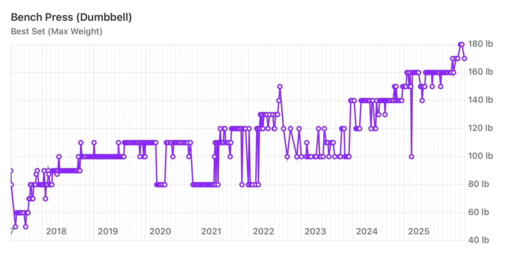 Bench pressing with dumbbells is another favorite. Even though my body stalled out in 2020, and then again in 2023, I kept pushing the weights up and down over my chest. I had to stop looking at my graph's downturns. I trusted that the weight increases would resume, and eventually they did.